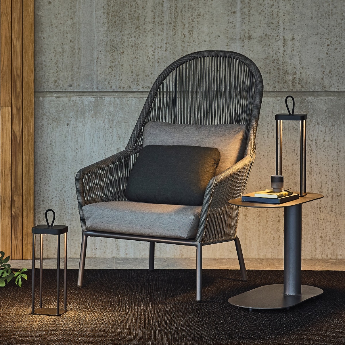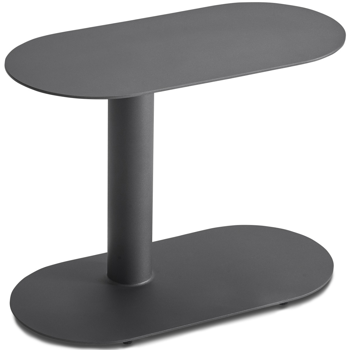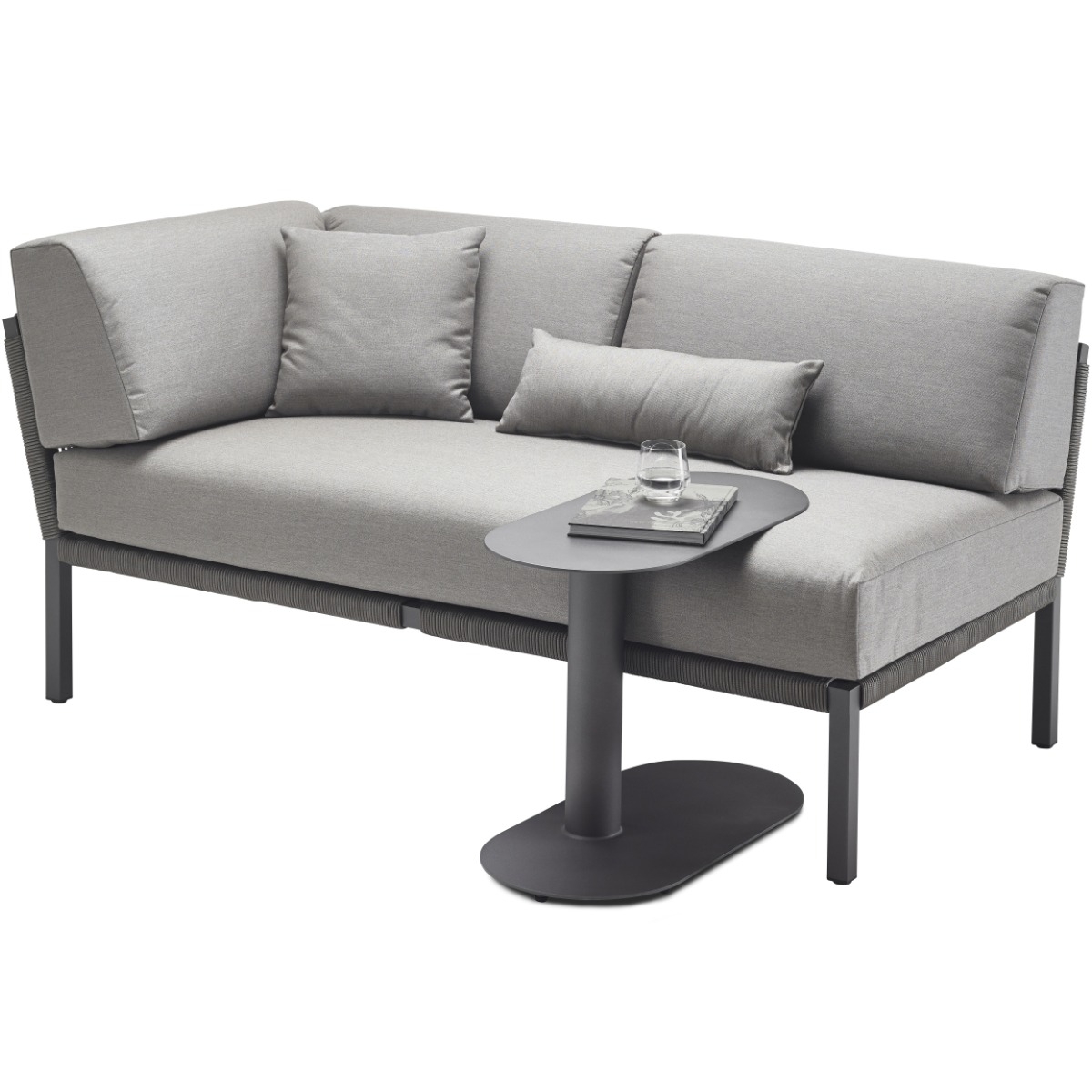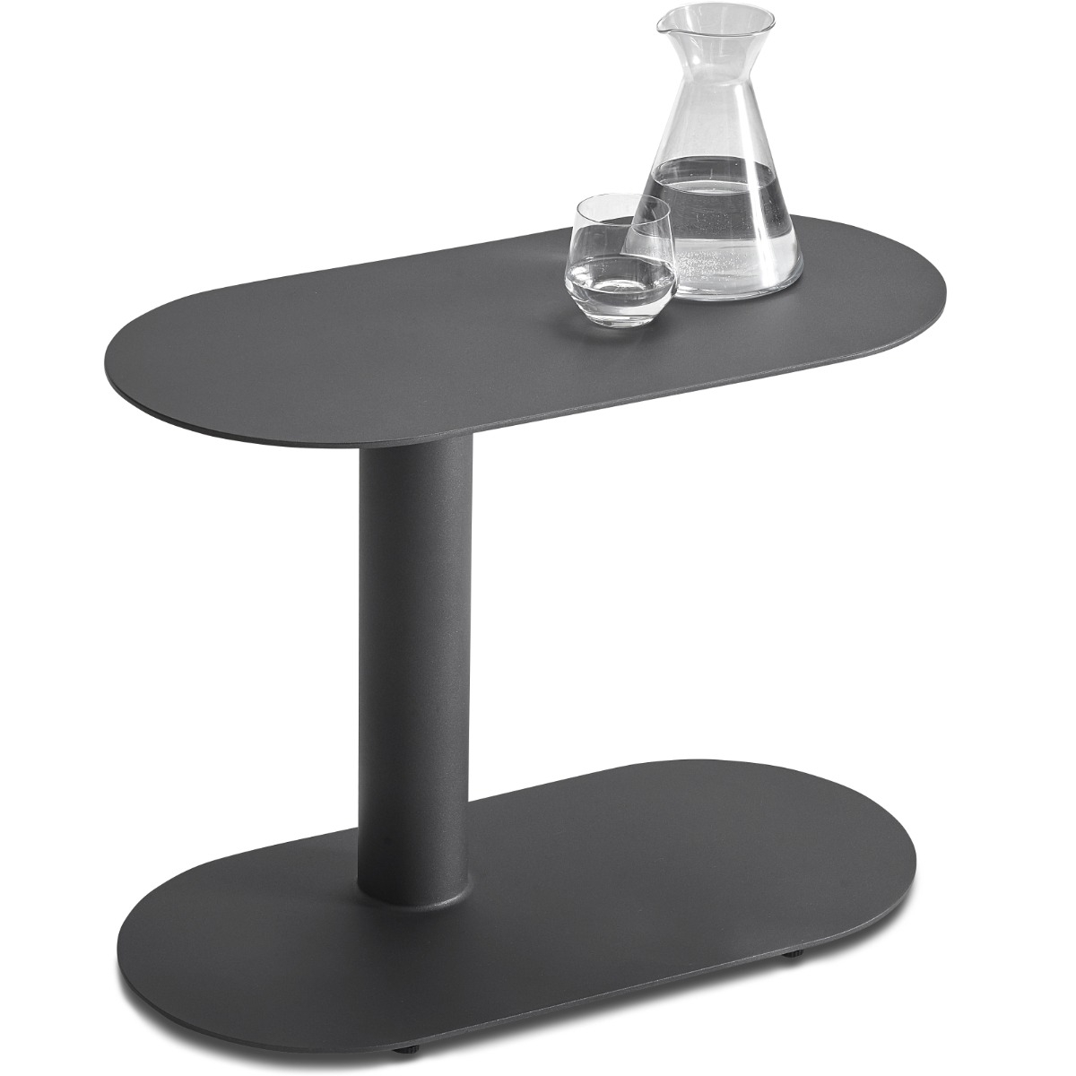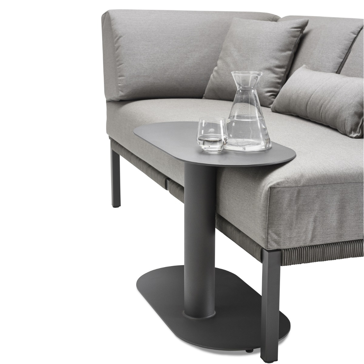 Durch die offenen Seiten kann dieser Beistelltisch aus anthrazit beschichtetem Aluminium bei einzelnen Sofas aber auch kombiniert mit großen Loungegruppen eingesetzt werden.