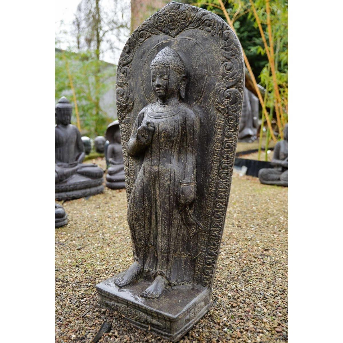 Diese Buddha Darstellung ist eher selten. Ein stehender Buddha als Relief in der Höhe von 130cm. Dieser Buddha ist aus Steinguss hergestellt und anschließend von Hand mit dem Finish nachbearbeitet worden. Auf die Frostfestigkeit hat das Finish keine Auswirkung.