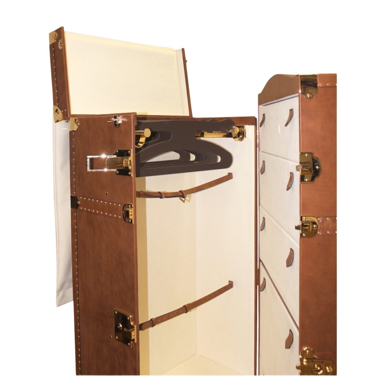 Diese vertikale Truhe bietet Ihnen den perfekten Platz, um alles, was Sie brauchen, griffbereit zu haben. Eine majestätische und prächtige Garderobe, die Sie rund um die Welt begleiten kann, um Ihre persönlichen Gegenstände aufzubewahren. Die verstellbaren Einlegeböden bieten maximale Flexibilität, um Schuhe, Stiefel oder Taschen unterzubringen. Die Innenfächer haben Türen, ein Schloss mit Schlüssel und einen hinteren Griff. Der mit Stoff bezogene Innenraum ist mit prächtigen Holzdekoren versehen, die diesen Koffer zu einem Kunstwerk machen. Ein treuer Begleiter bei Reiseabenteuern, hergestellt aus wunderbarem, pflanzlich gegerbtem Leder und erhältlich in verschiedenen klassischen Farben. Die Marco-Polo-Kollektion ist nicht nur den Liebhabern von Vintage und Antiquitäten gewidmet, sondern allen Reisenden, die einen klassischen Geist besitzen und sich dem Abenteuer und der Entdeckung verschrieben haben.