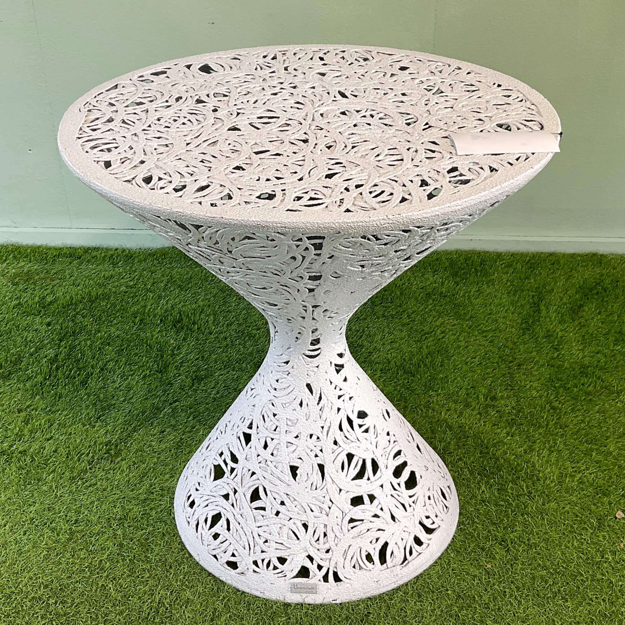 Wie Sie vielleicht bemerken, ähnelt der Tisch einer Sanduhr. Der Designer Raimonds Cirulis findet seine Inspiration für seine Entwürfe überall. Lassen Sie ihn das ganze Jahr über draußen stehen. Keine Wartung erforderlich. Widerstandsfähig gegen UV-Strahlung, Salz und Chlor. Absorbiert Schall. Absorbiert Wärme, damit Sie sich in der Sonne nicht verbrennen. Da alle Möbel handgefertigt sind, können Maße, Gewicht, Farbe, Struktur und Muster variieren.