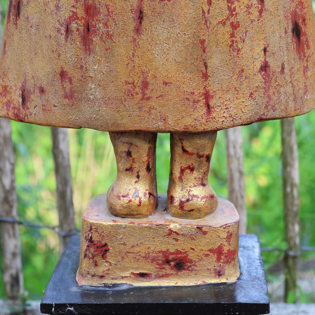 Diese hochwertige Buddhafigur ist handgeschnitzt und koloriert. Eine Farbkombination aus einem goldenen Grundton vermischt mit rot-orangenen Farbsegmenten sorgt für ein angenehmes und edles Erscheinungsbild der Schnitzerei.