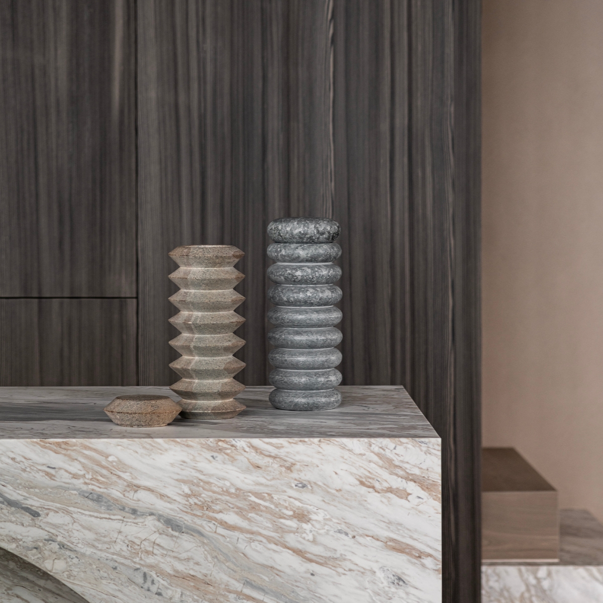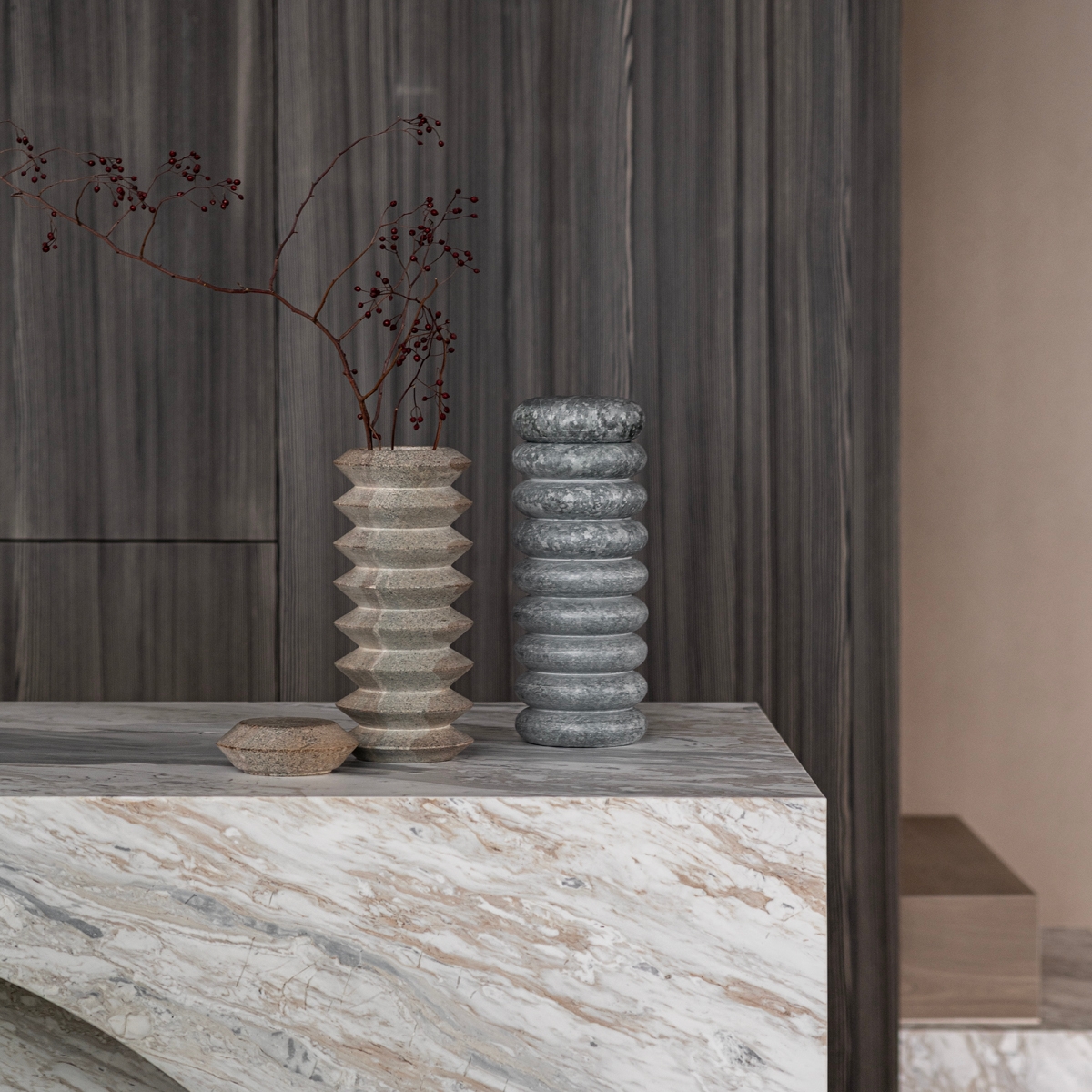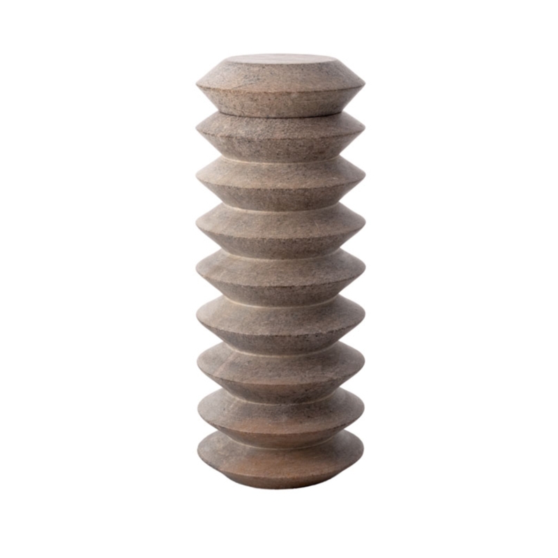 Die Torre Vasen sind innovative Vasen aus handgeschnitztem brasilianischem Speckstein. Sie sind geöffnet als Vase oder geschlossen als dekorative Skulptur verwendbar.