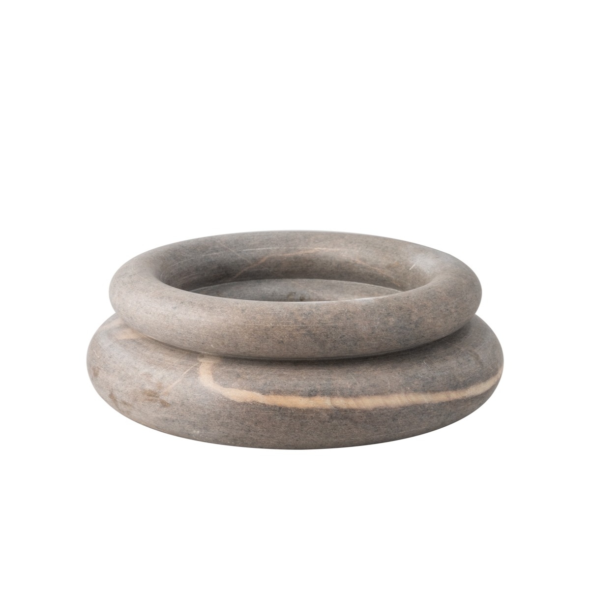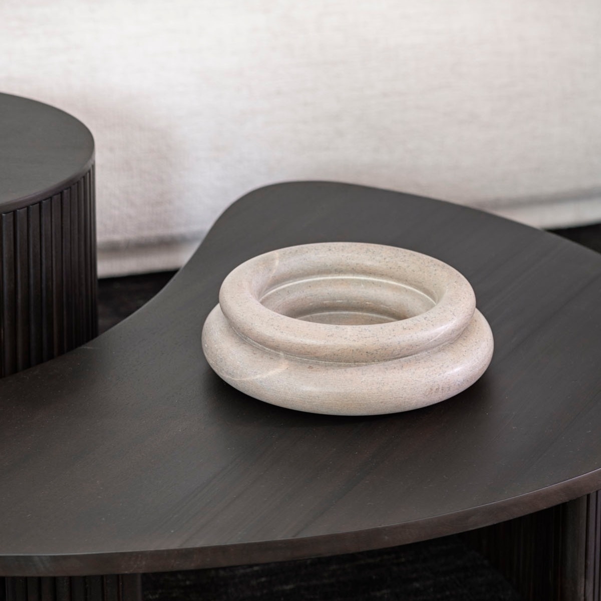 Vaso Gomos - Gomos bedeutet Segmente - ist eine flache dekorative Vase aus handgeschnitztem brasilianischem Speckstein. Speckstein ist ein natürlich poröser Stein, der nicht mit Wasser oder anderen Flüssigkeiten verwendet werden sollte. Die Farbe des Specksteins kann von zartem Beige bis zu leuchtendem Blau und silbrigem Grau variieren.