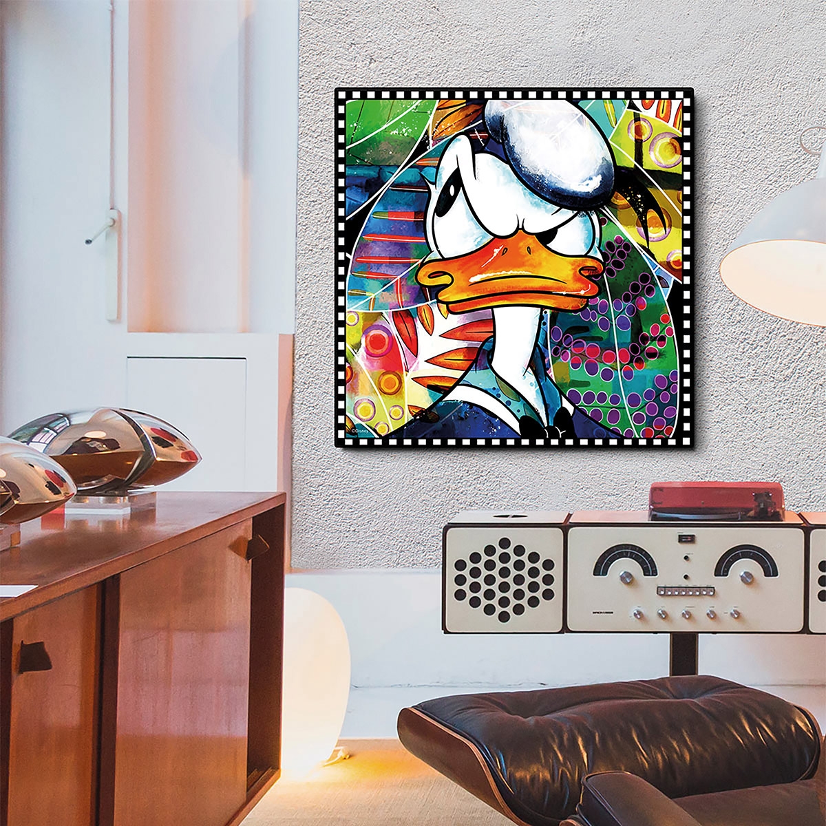 Bringen Sie gute Laune an Ihre Wände mit unserem Leinwandbild "Donald Duck"! Das farbenfrohe Motiv zeigt den beliebten Disney-Klassiker mit seinem typischen, missmutigen Gesichtsausdruck; wahrscheinlich ärgert er sich, dass er für das Portrait so lange still halten muss.