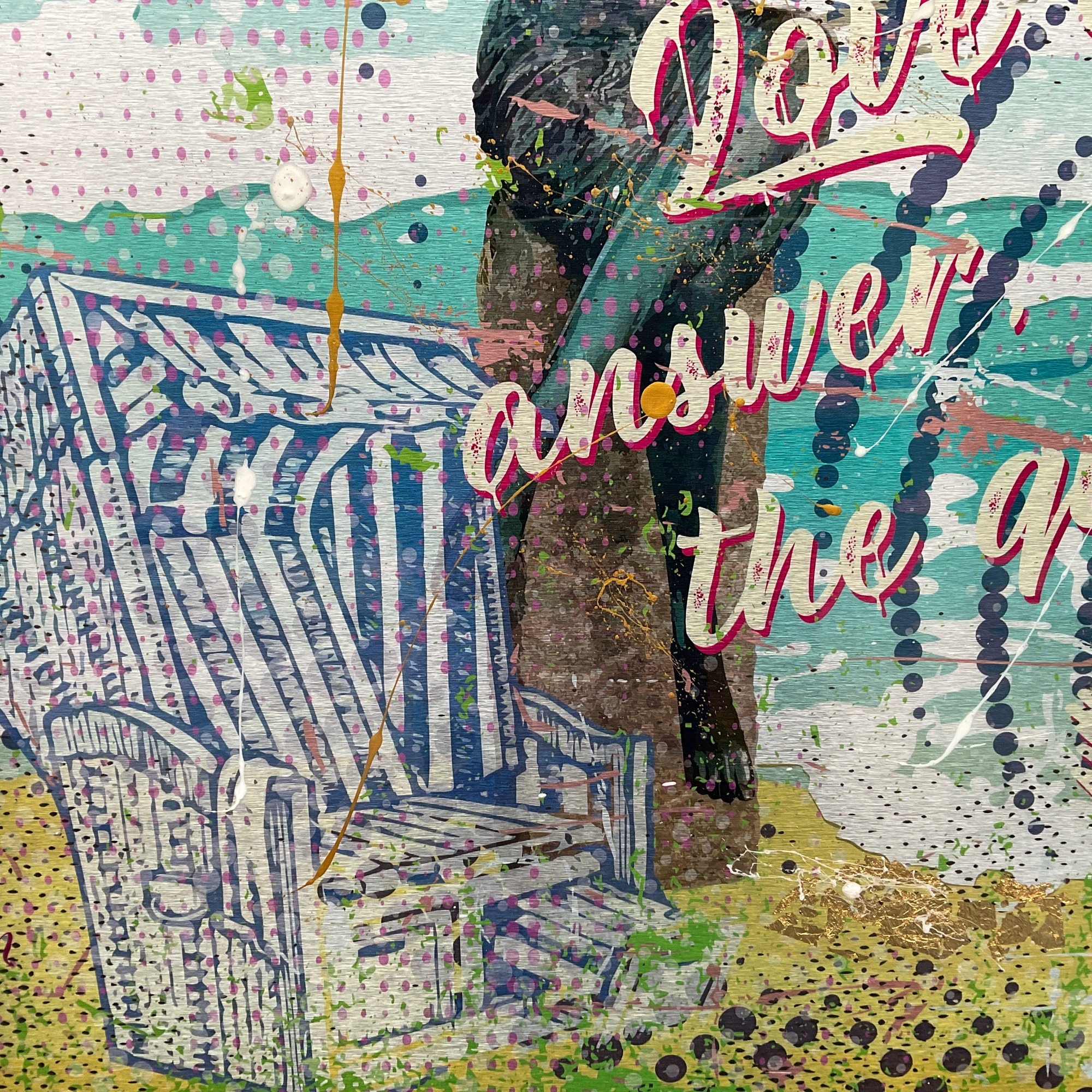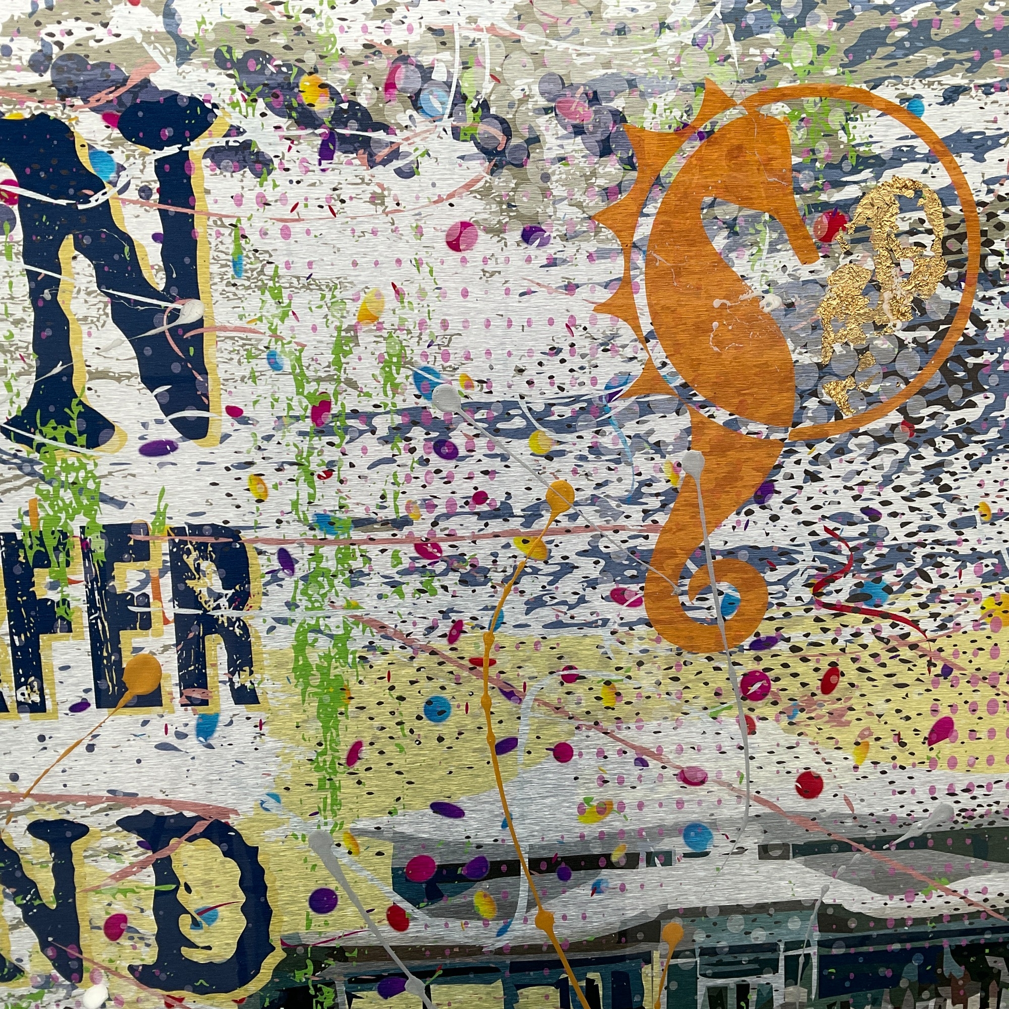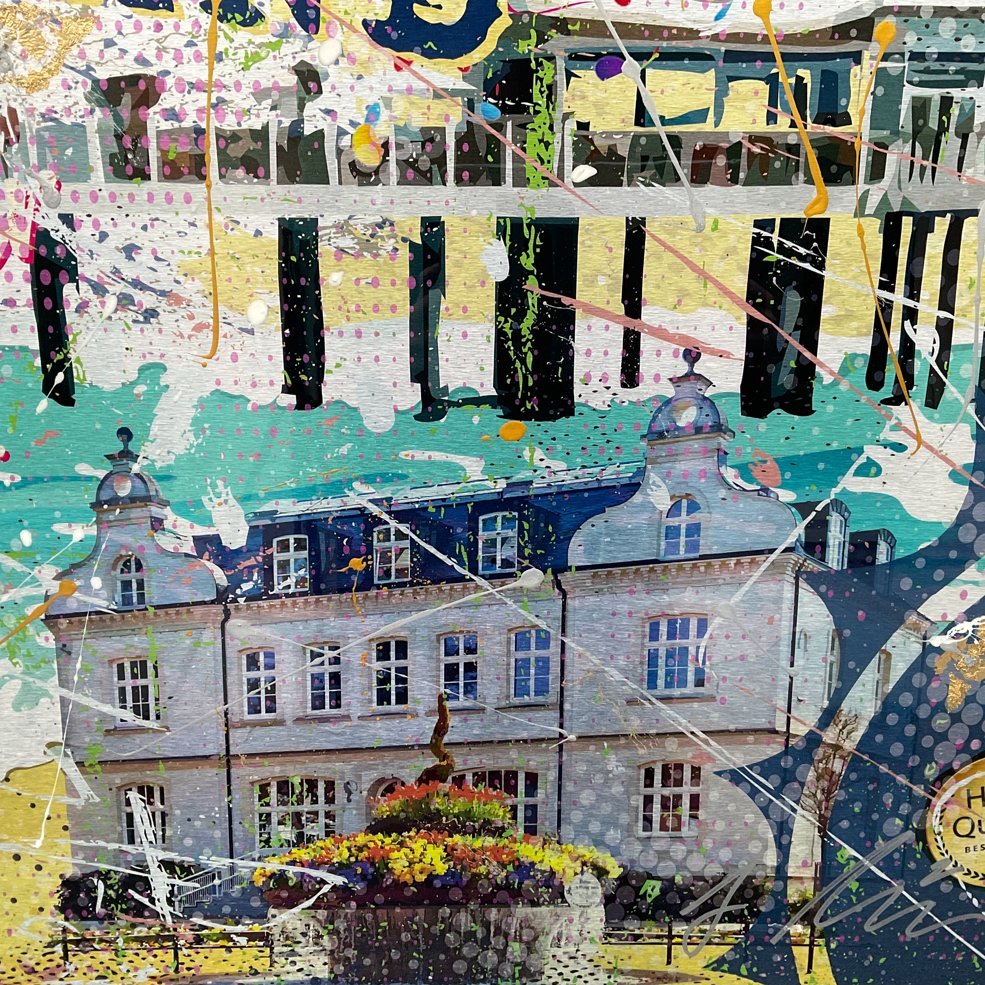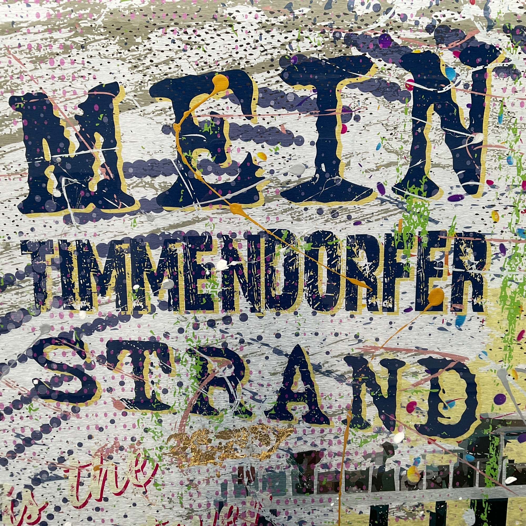 „Mein Timmendorfer Strand“ ist ein vielschichtiges, energiegeladenes Werk des deutschen Künstlers Gerd Müller, dessen künstlerische Laufbahn seit 2009 von der intensiven Auseinandersetzung mit Material, Oberfläche und Raum geprägt ist. Der Kunstdruck auf Aluminium-Dibond verbindet urbane Collagetechnik mit maritimen Motiven der Ostseeküste und erschafft so ein zeitgenössisches Erinnerungsbild voller Dynamik und Emotion. Die auf gebürstetem Aluminium erzeugten Reflexe verleihen dem Werk eine lebendige Tiefe, während Kompositionsgold, farbige Splashes und eine abschließende Epoxidharz-Schicht die Oberfläche akzentuieren und veredeln. Die typischen Elemente des Künstlers – grafische Überlagerungen, typografische Einsprengsel und ikonische Timmendorfer Wahrzeichen – verschmelzen zu einem modernen Küstenporträt. Der Schriftzug „Love is the answer – whatever the question“ verstärkt die positive, lebensbejahende Botschaft und macht das Werk zu einem starken Statement Piece.