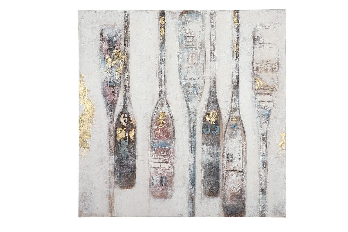 Handgemaltes Wandbild von mehreren Paddeln. Das Bild ist mit mehreren Zahlen versehen. Durch die vielen kleinen Details, wirkt dieses Bild sehr vielfältig und lässt den Betrachter genauer hinschauen.