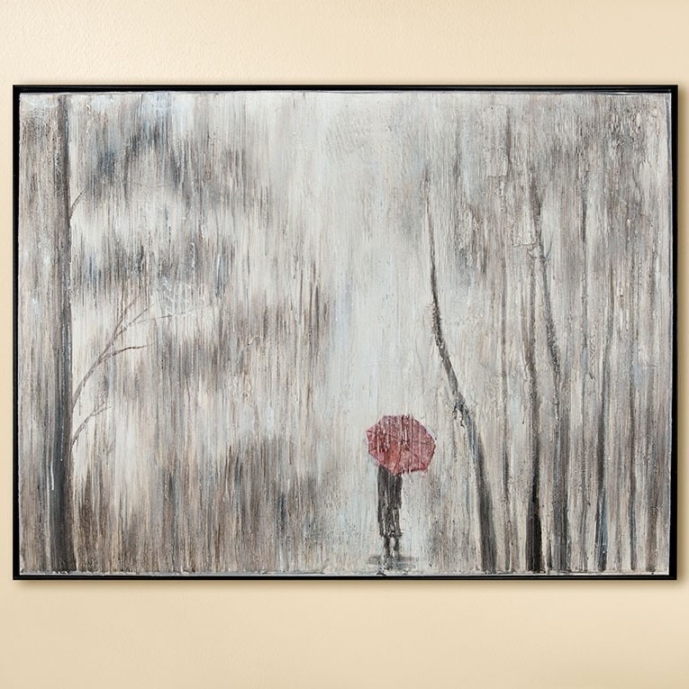 Wunderschönes Ölbild mit einem angedeutet blätterlosen Wald im strömenden Regen. Im Fokus des Bildes spaziert jemand in einem langen Mantel mit rotem Regenschirm.