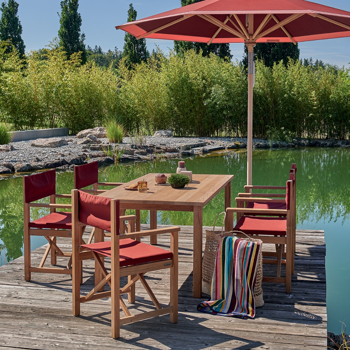 Passend dazu gibt es die sechsfach verstellbaren Liegestühle in zwei Ausführungen und weiteren Extras sowie Tische aus massivem Teak in unterschiedlichen Längen.