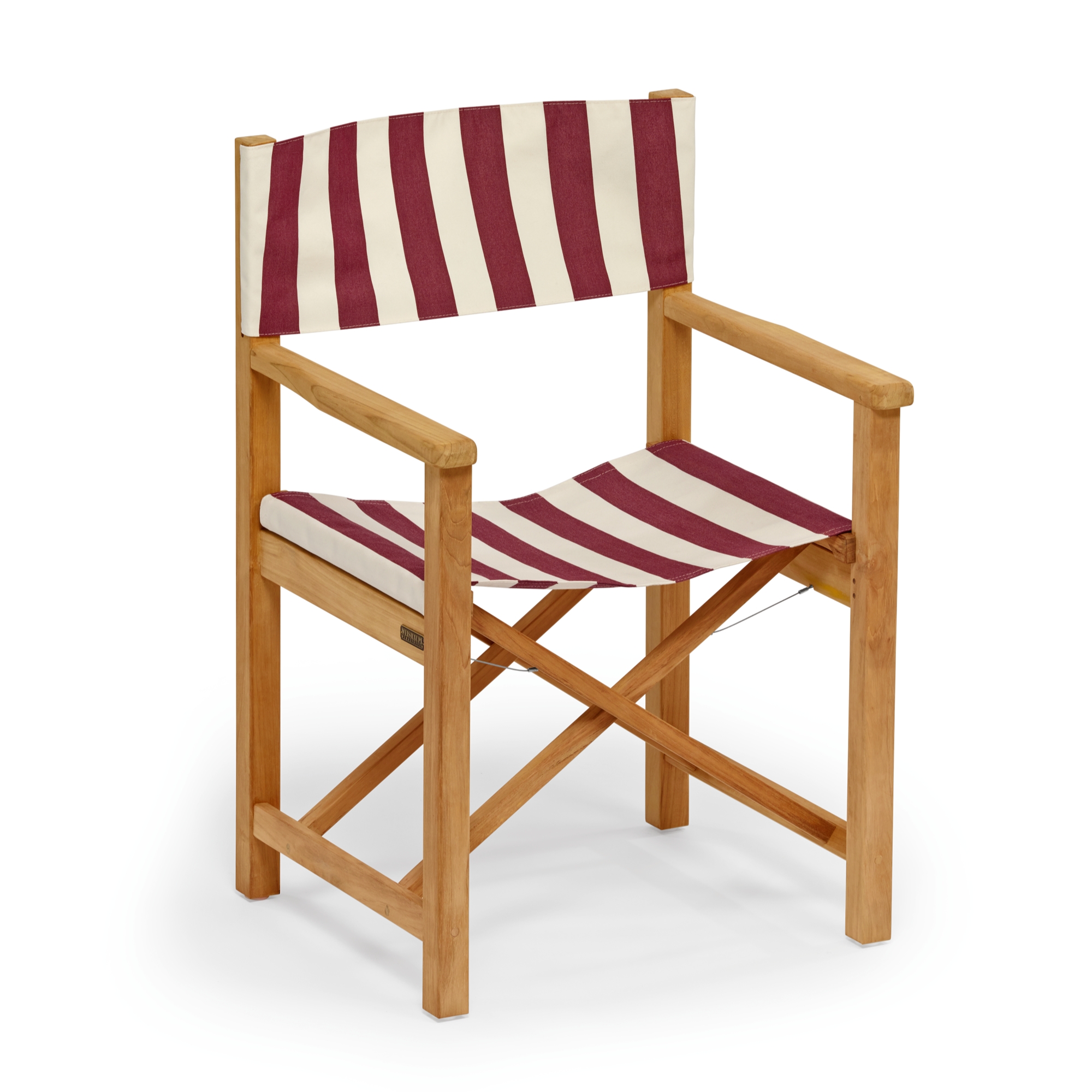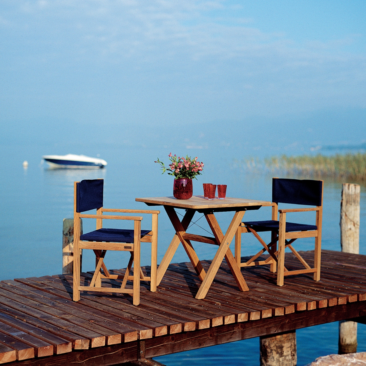 Diesen Sessel hat Weishäupl dem klassischen Regiestuhl nachempfunden. Durch seinen Korpus aus massivem Teak bekommt er einen edlen Look. Wenn Sie mögen, wählen Sie dazu kräftige Farben aus unserem komplett wetterfesten Stoffprogramm als Kontrast.