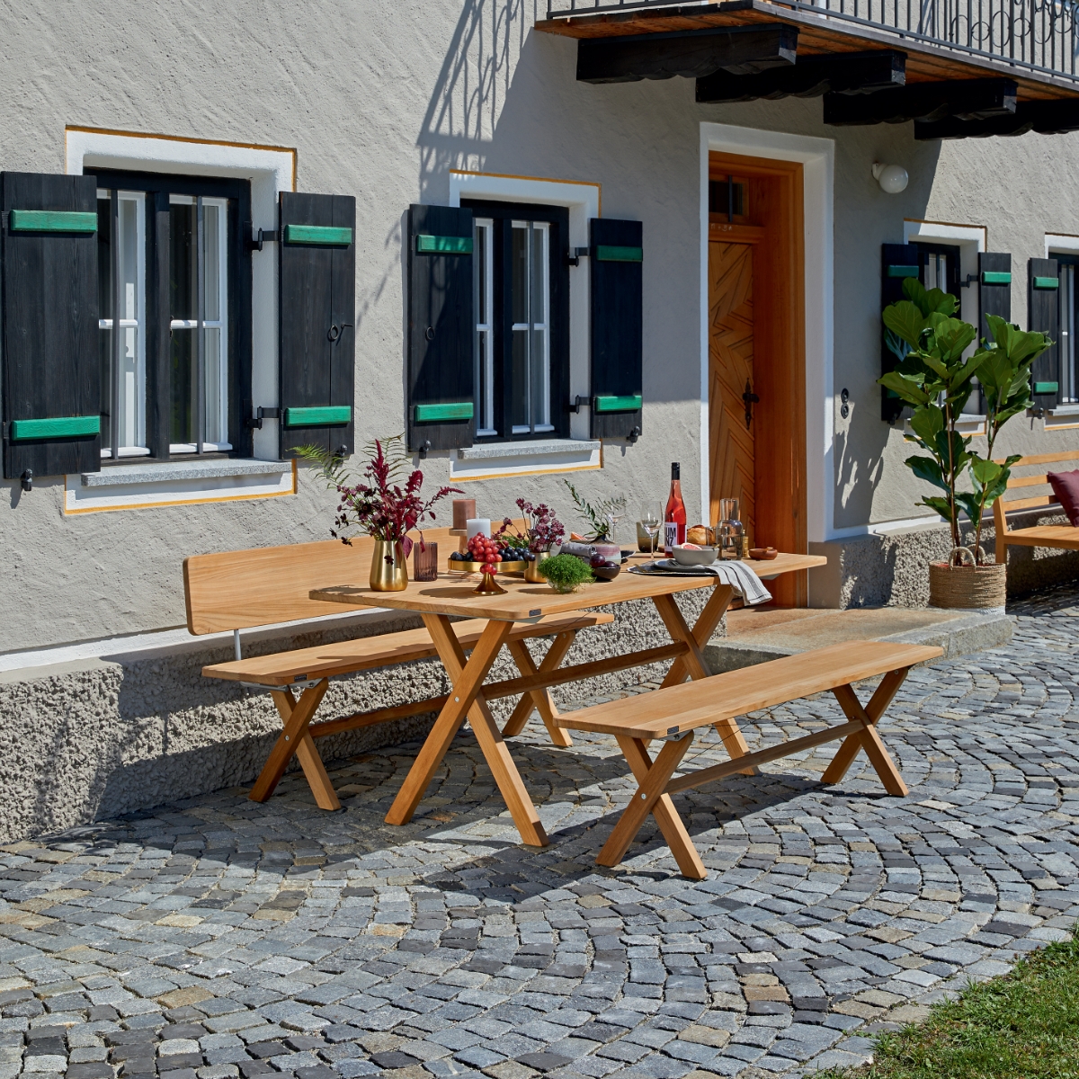 Herausgekommen ist dabei ihr CROSS Programm aus massivem Teak. Die Bänke gibt es in zwei Längen. Durch abnehmbare Rückenlehnen und bequeme Polsterauflagen laden sie zum Sitzenbleiben ein. Passend dazu bieten sie verschieden lange Tische an.