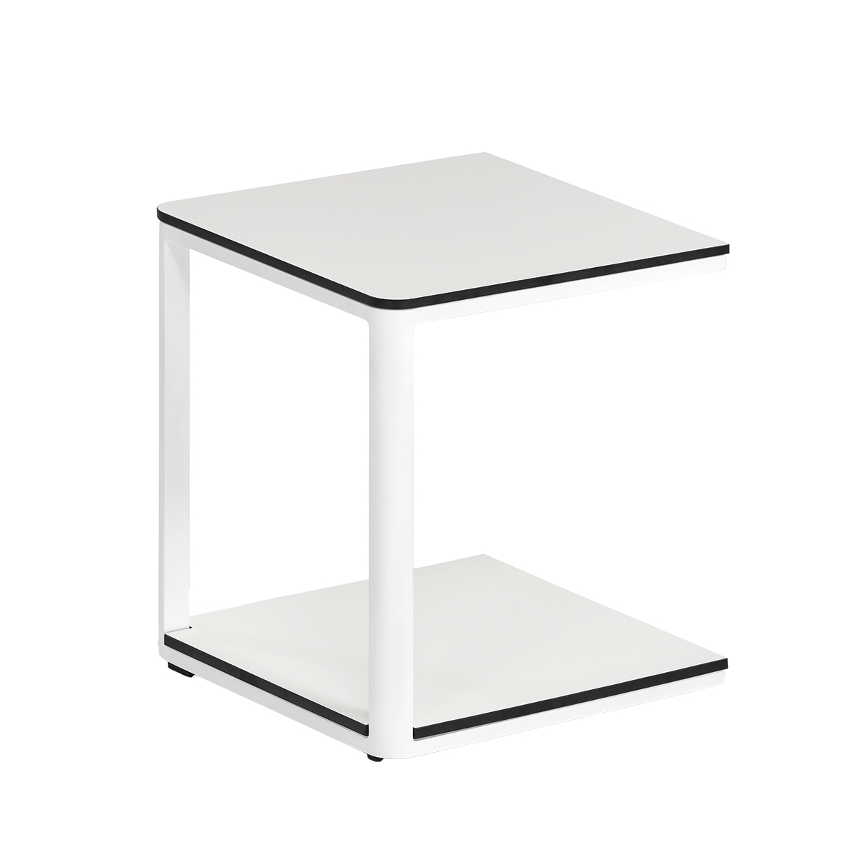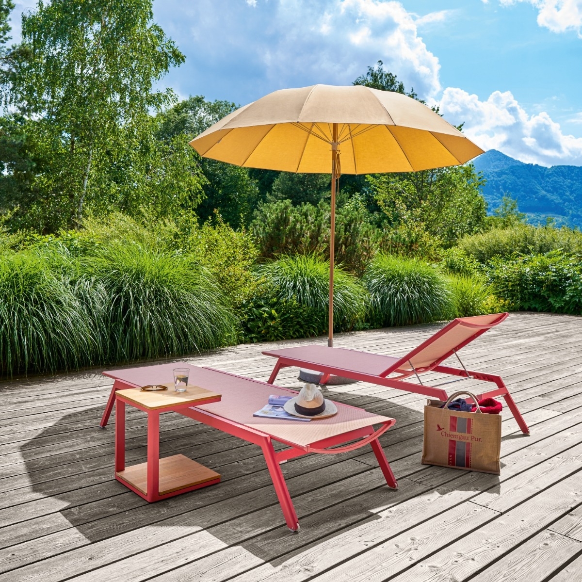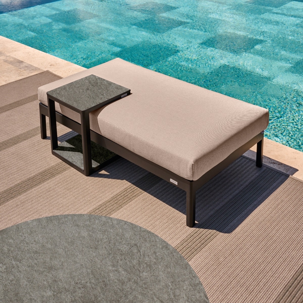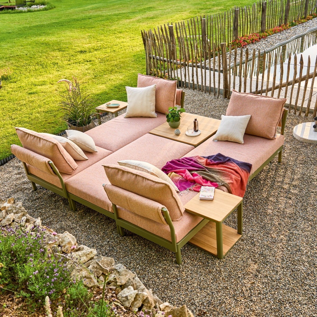 Ein optionales Einhängetablett mit Einlage aus Teakholz oder HPL ergänzt das System. Tische in verschiedenen Größen und Ausführungen runden den Outdoor-Lounge-Look ab und bieten vielfältige Gestaltungsmöglichkeiten.