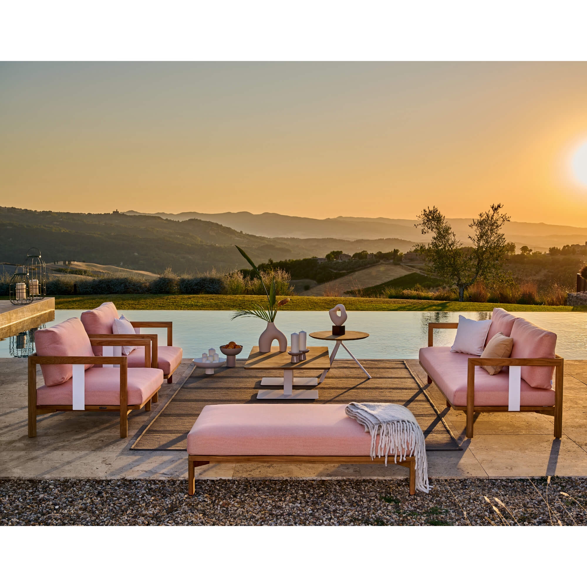 Metallwangen aus Edelstahl AISI 304Der Beistelltisch aus der Kollektion New Hampton von Weishäupl verbindet zeitloses Design mit höchstem Komfort. Das elegante Gestell aus massivem Teakholz wird durch seitliche Metallelemente in Weiß, Anthrazit oder Edelstahl stilvoll ergänzt. Die großzügigen, dicken Polster sorgen für ein entspanntes Sitzgefühl und sind in vielen Farben und Stoffqualitäten erhältlich. Ob auf der Terrasse oder im Wohnzimmer – dieser Sessel ist ein echtes Lieblingsstück mit Lounge-Charakter.