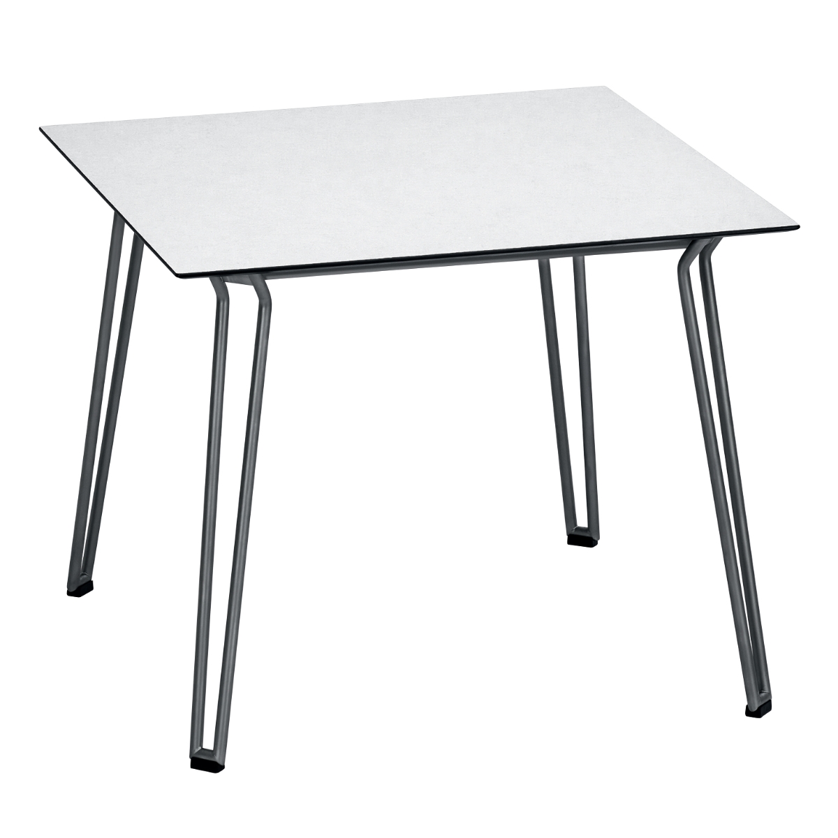 Der quadratische Slope Tisch zeichnet sich durch eine besondere Form des Gestells aus. Vier Doppelröhren tragen die Tischplatte elegant und bieten durch ihre Ausrichtung nach außen viel Platz für Stühle und Beine.