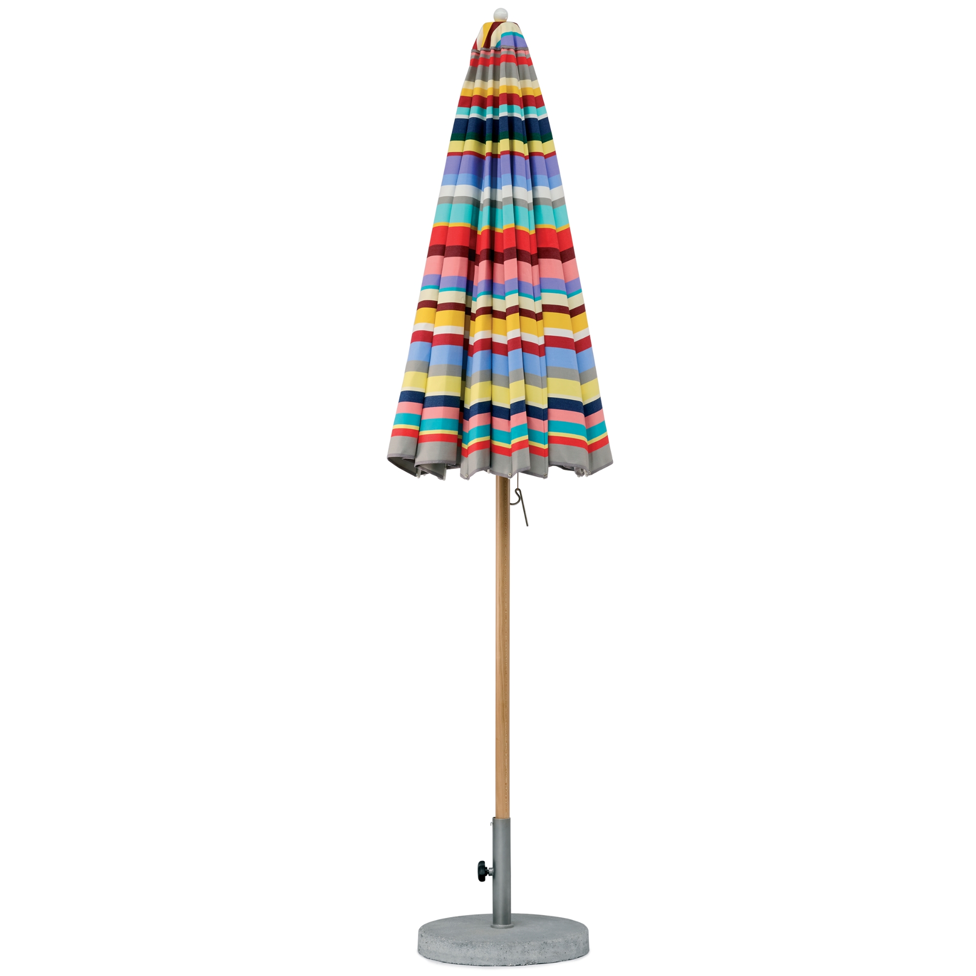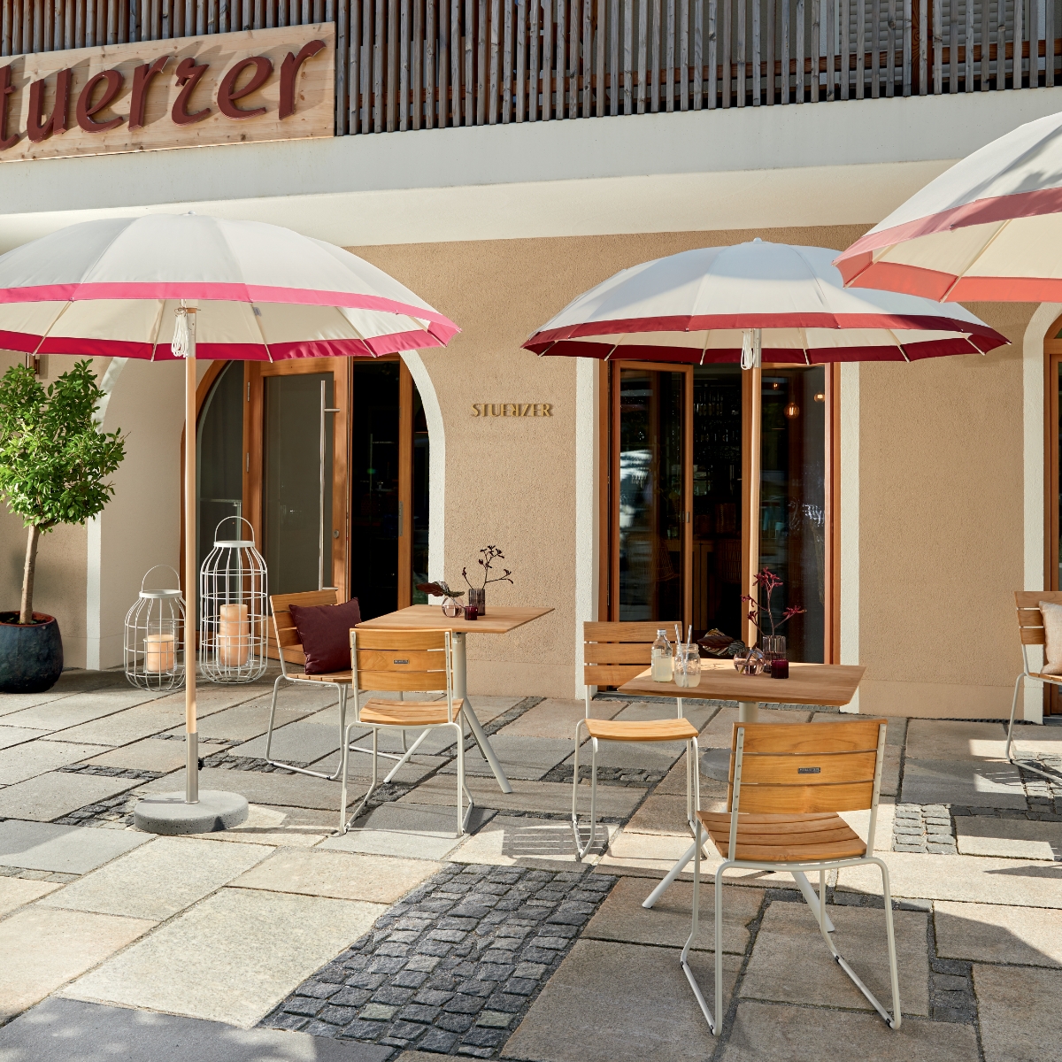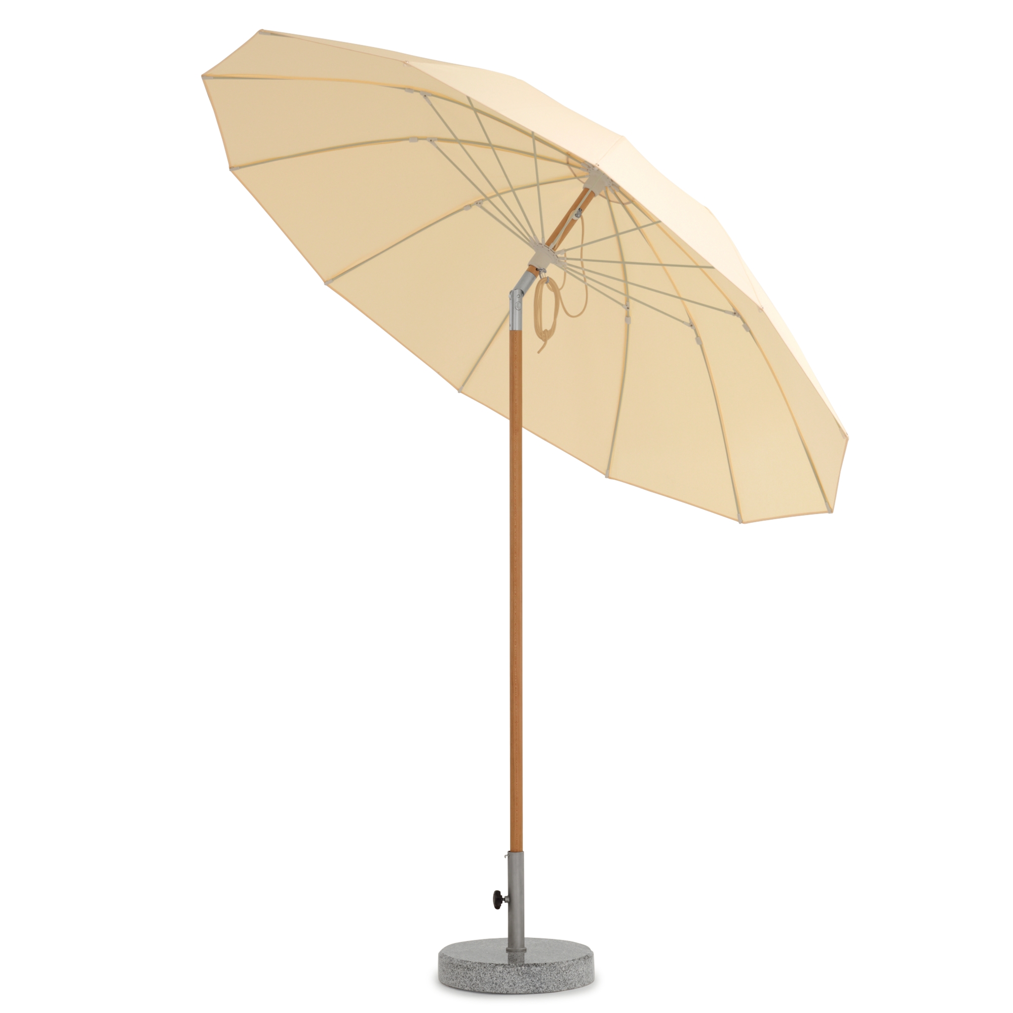 Weishäupl hat seinen PAGODENSCHIRM für den Sonnenschein konzipiert und bietet ihn mit einem Schirmmast aus pulverbeschichteten Aluminium oder lackiertem Hartholz an. Es gibt ihn in zwei verschiedenen Größen, den kleineren auch mit Knick. Die Bespannung wird durch Fiberglasstäbe und Naben aus Polyamid getragen, ein Flaschenzug macht das Öffnen kinderleicht.