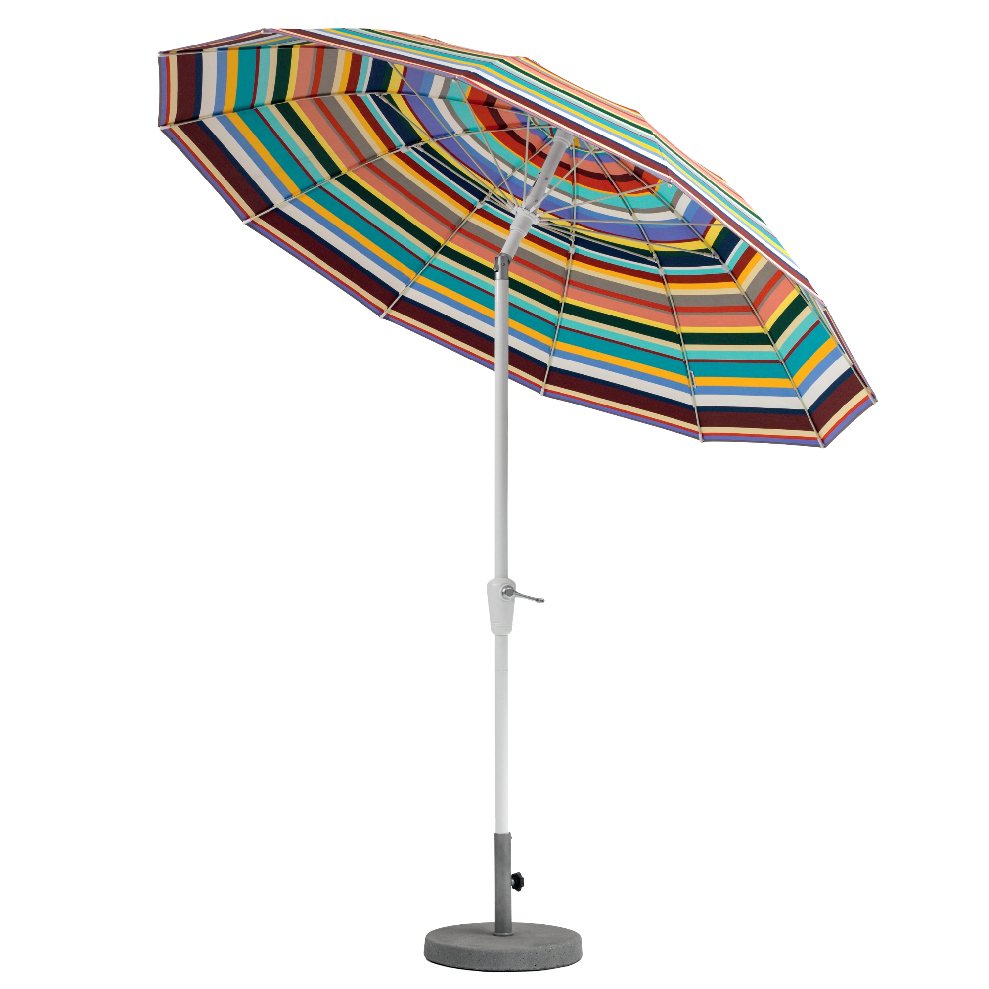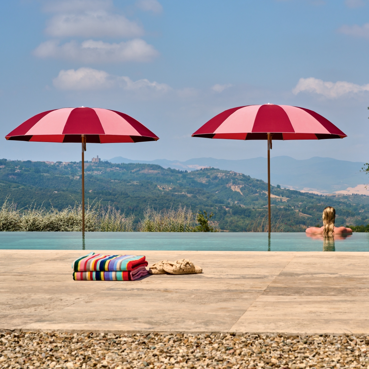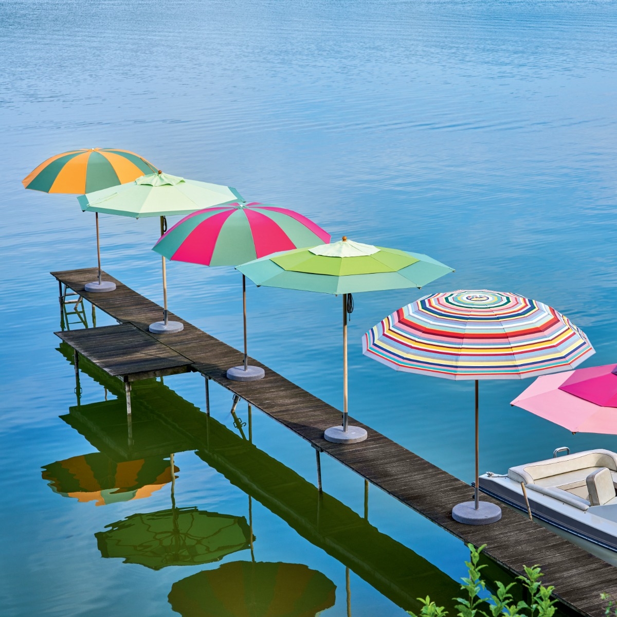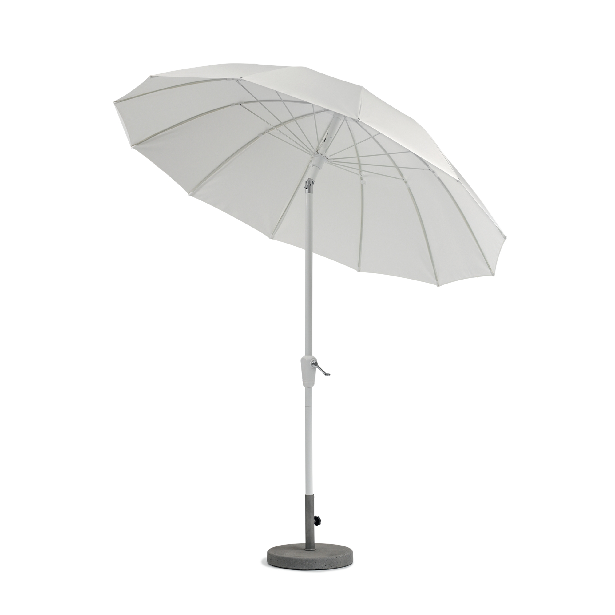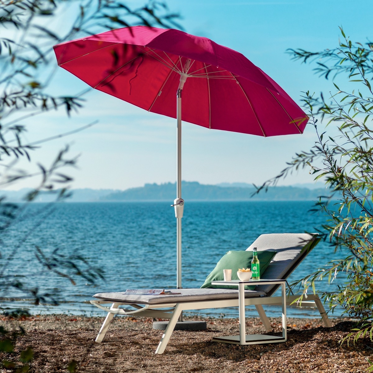 Weishäupl hat seinen PAGODENSCHIRM für den Sonnenschein konzipiert und bietet ihn mit einem Schirmmast aus pulverbeschichteten Aluminium oder lackiertem Hartholz an. Es gibt ihn in zwei verschiedenen Größen, den kleineren auch mit Knick. Die Bespannung wird durch Fiberglasstäbe und Naben aus Polyamid getragen, ein Flaschenzug macht das Öffnen kinderleicht.