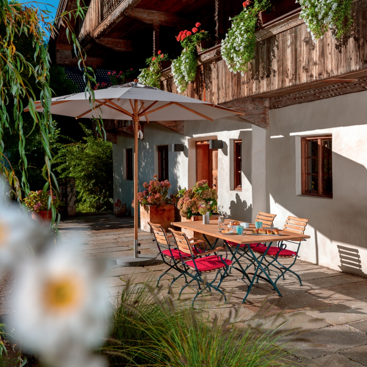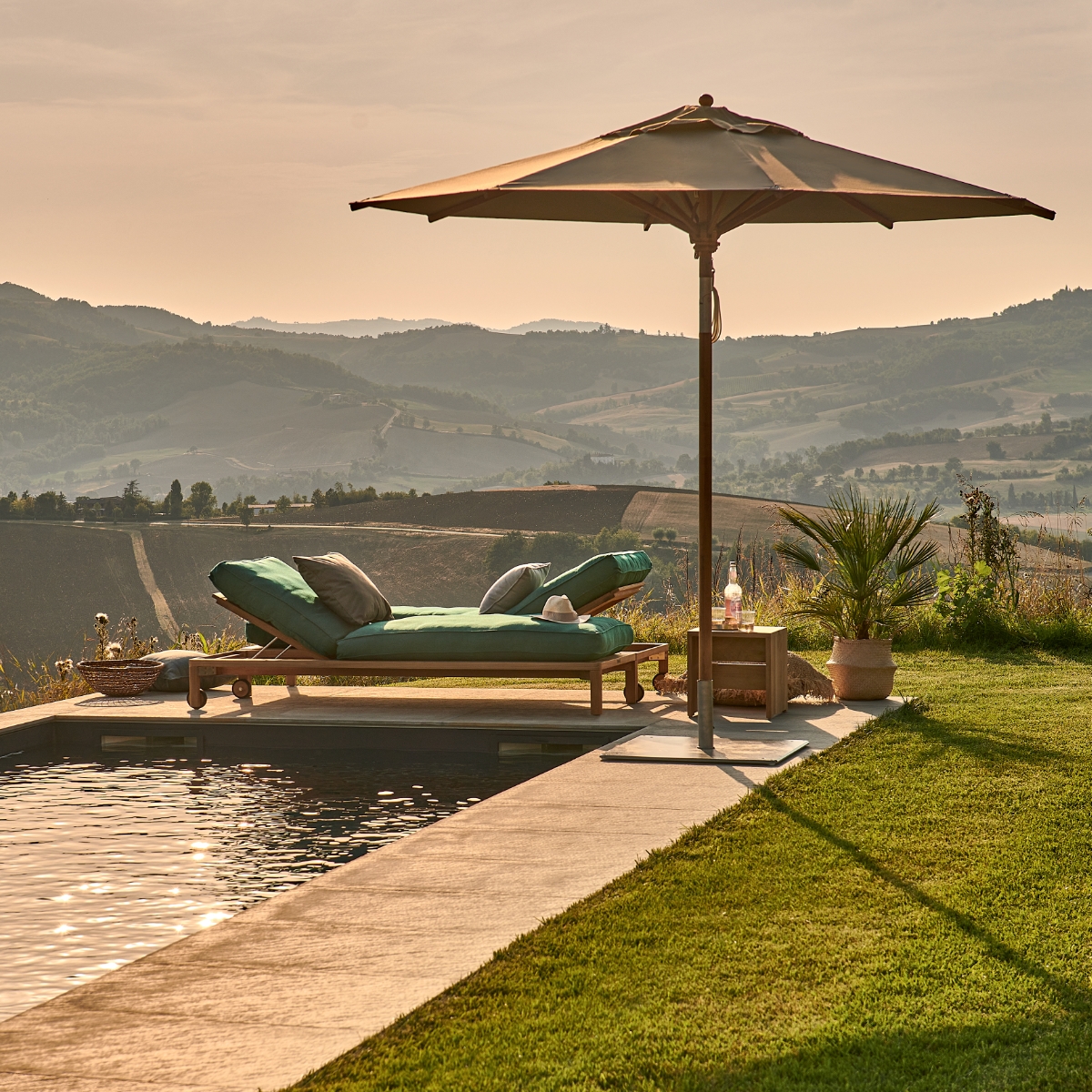 Unsere Teakschirme greifen genau diesen Anspruch auf: Edles Design trifft auf langlebige Qualität. Alle Bestandteile – von den Streben über die Schirmnabe bis zum Stamm – sind zusätzlich oberflächenimprägniert und damit besonders robust.