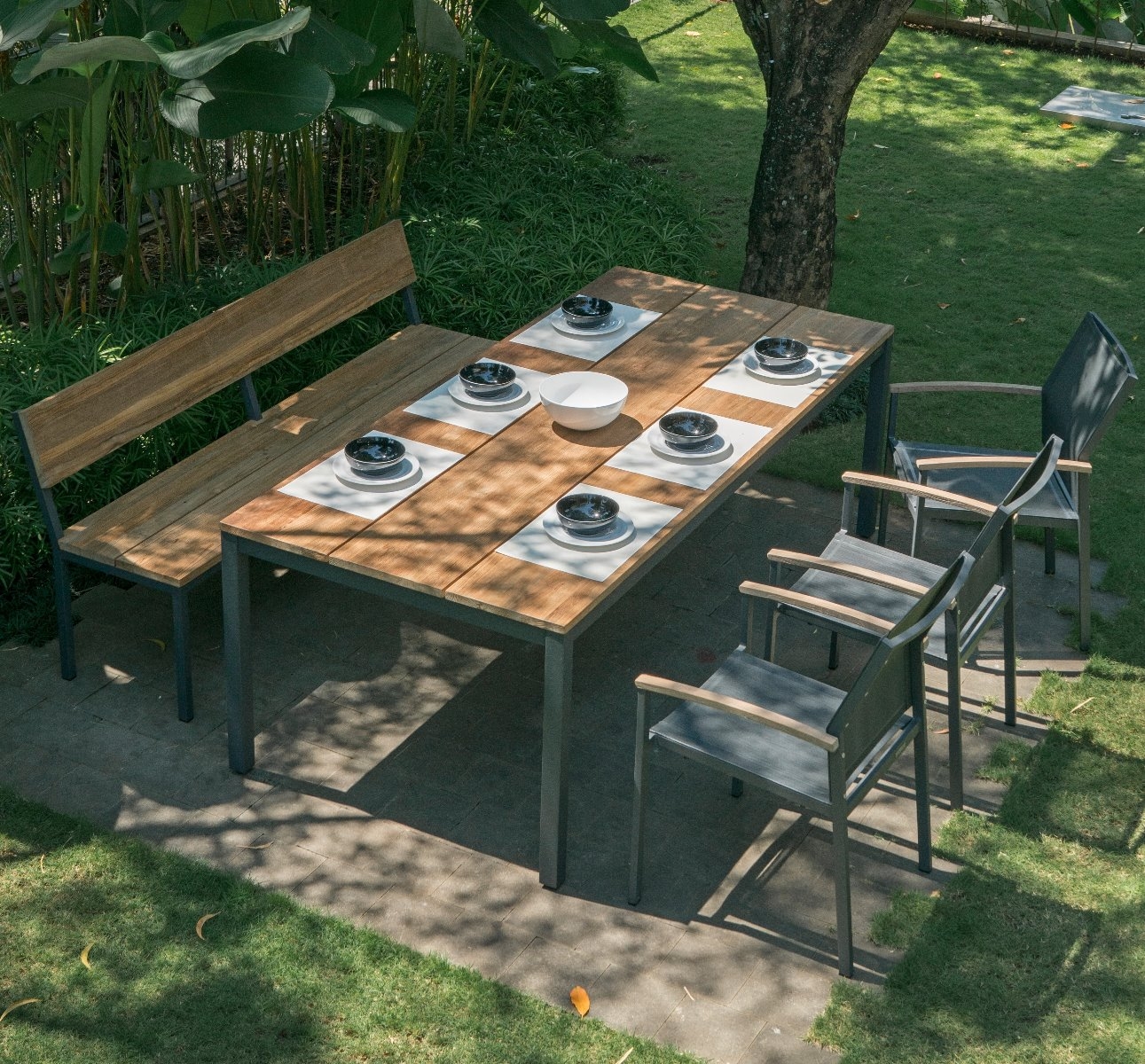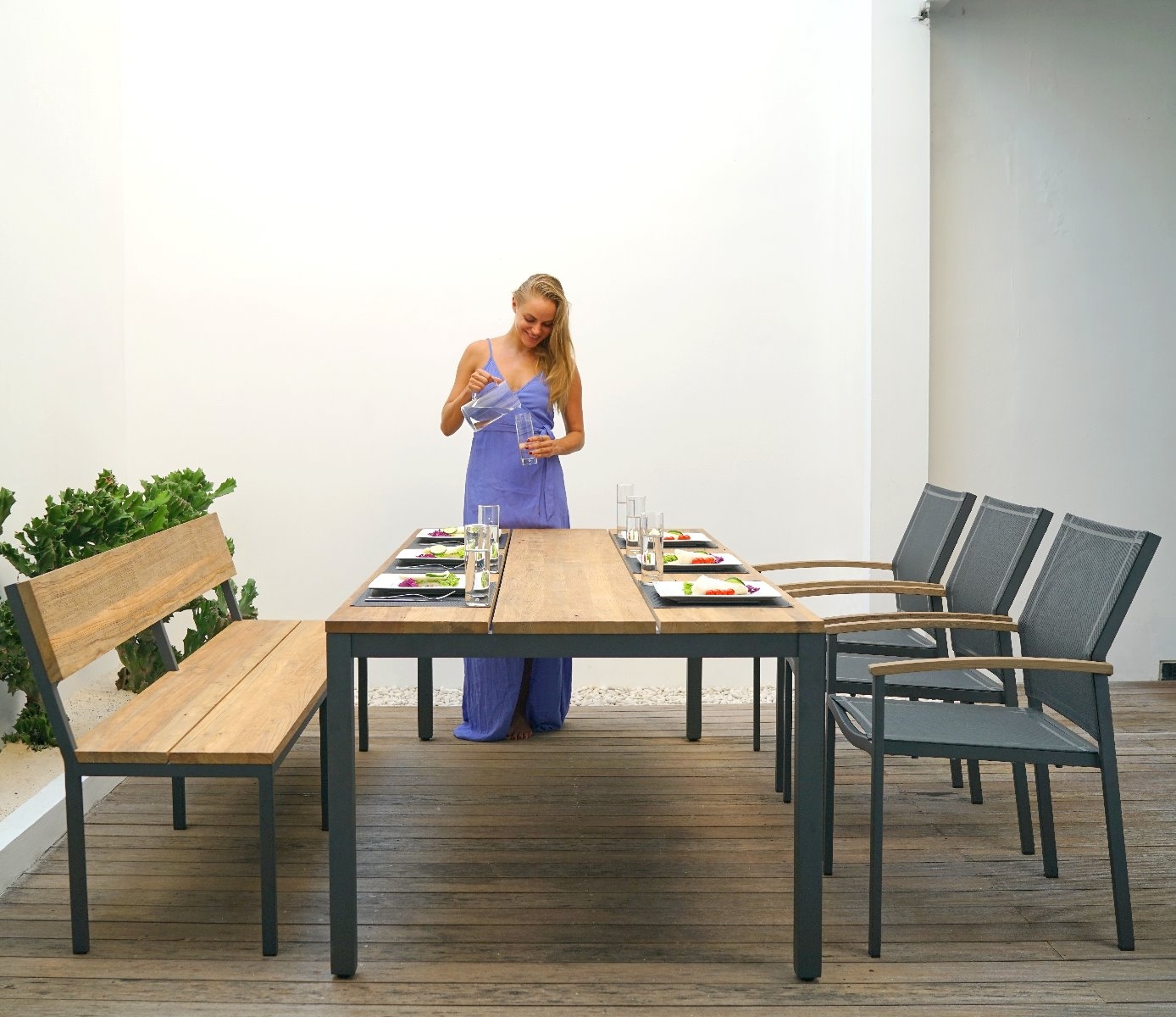 Mit Alex findet die greenline-Produktreihe eine neuartige Erweiterung: Alex besticht durch eine rechteckige Tischplatte aus drei breiten, längs verlaufenden Teakholzplanken. Getragen wird die Tischplatte aus recyceltem Teak von einem Untergestell aus pulverbeschichtetem Aluminium. Dabei bildet das dunkle Grau („graphite“) des Tischgestells einen schönen Kontrast zum warmen Holzton der Tischplatte. Der Tisch mit den Abmessungen 220 x 100 cm bietet Platz für acht Personen.