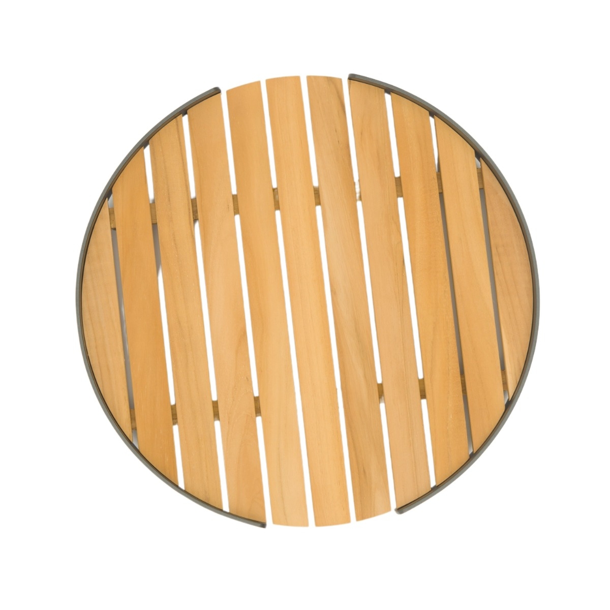 Ein Rahmen aus pulverbeschichtetem Aluminium in „graphite“ 5150 trägt die runde Tischplatte aus Teak und lässt sich flexibel zu diversen Sesseln der ZEBRA-Kollektion kombinieren.Teakholz ist aufgrund der natürlichen Eigenschaften widerstandsfähig gegen Hitze, Kälte, Nässe, Trockenheit sowie Sonneneinstrahlung und ist daher ganzjährig im Außenbereich einsetzbar.